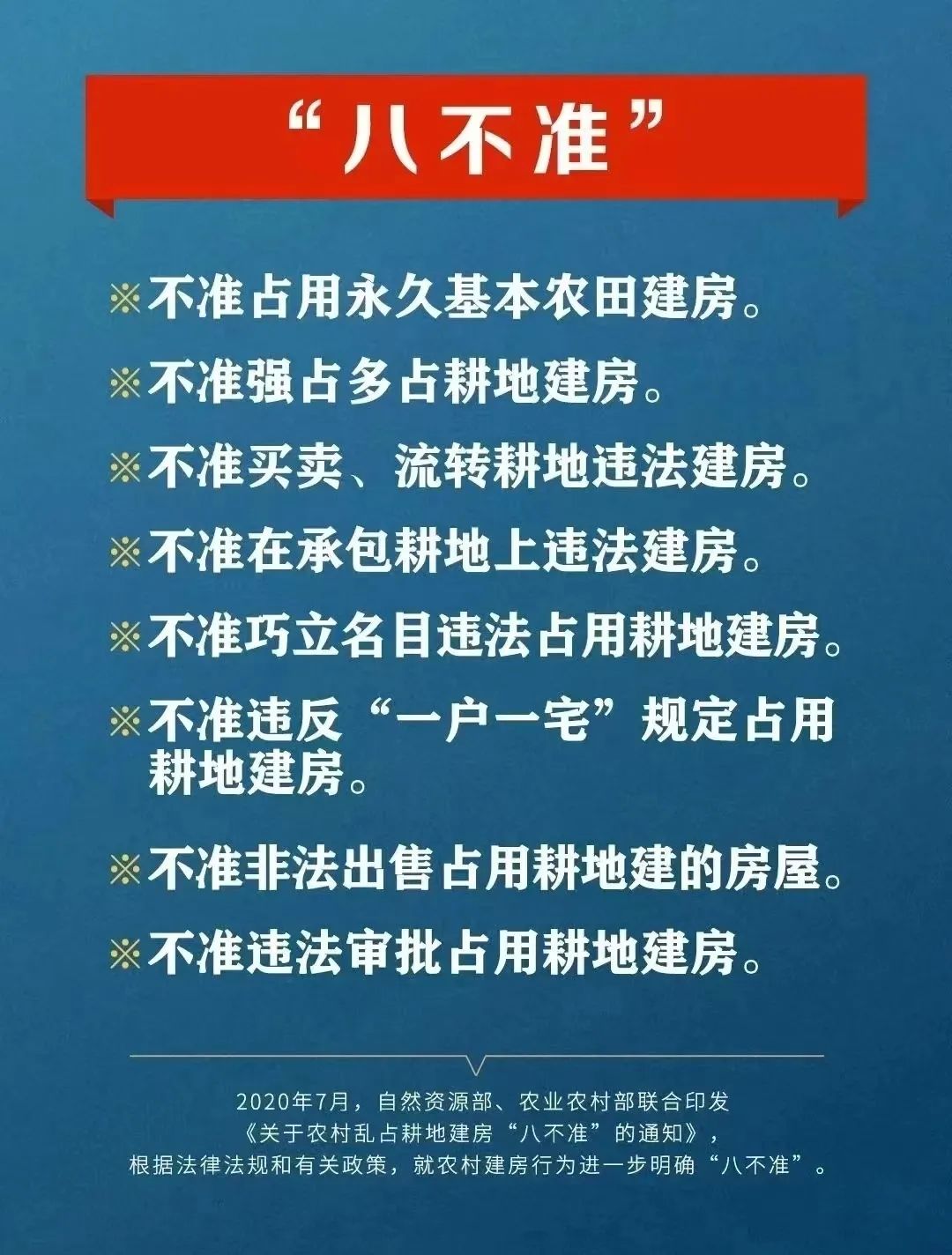 同時,再次提醒廣大村民群眾要深刻認識耕地保護的重要性,務必要做到“先審批、后建房”,違法代價慘痛,一定要牢記農(nóng)村亂占耕地建房“八不準”,打消僥幸心理,切勿以身試法!