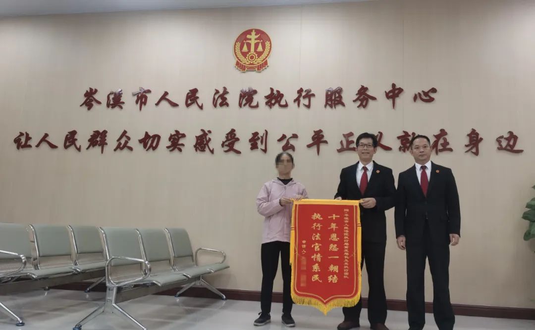 10月29日下午,當(dāng)事人廖某、易某情真意切地對(duì)執(zhí)行法官說(shuō):“法官,感謝法院解了我們十年的心結(jié)?!彪S后,對(duì)執(zhí)行局局長(zhǎng)黃友及辦案團(tuán)隊(duì)送上一面印著“十年恩怨一朝結(jié)、執(zhí)行法官情系民”的錦旗以表達(dá)深深的感謝。
