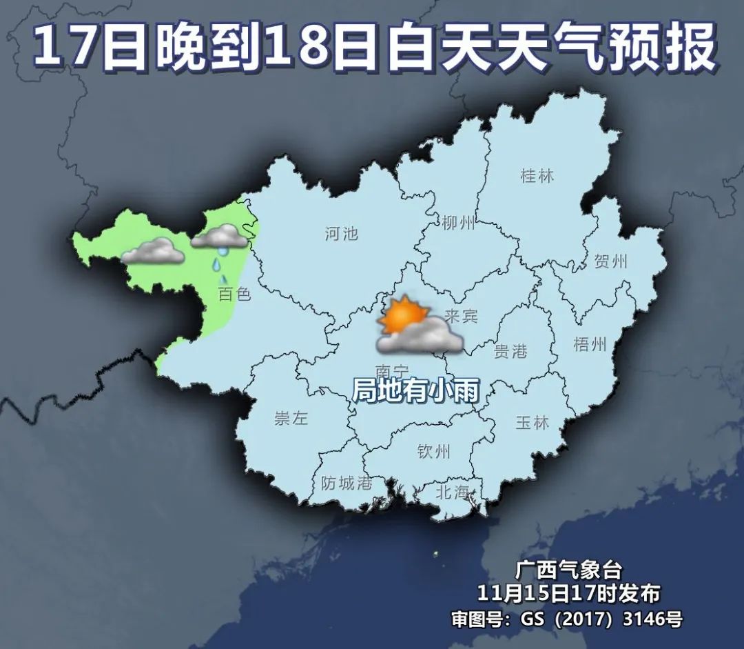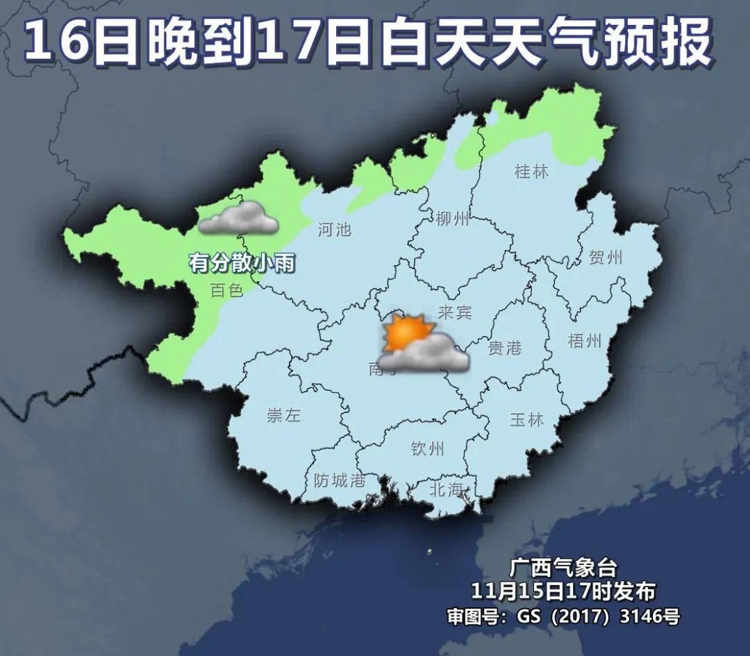 16日晚上到17日白天,百色、河池、桂林等市多云到陰天有分散小雨,其它地區(qū)多云。桂東部分地區(qū)有偏北風(fēng)5~6級、陣風(fēng)7級。