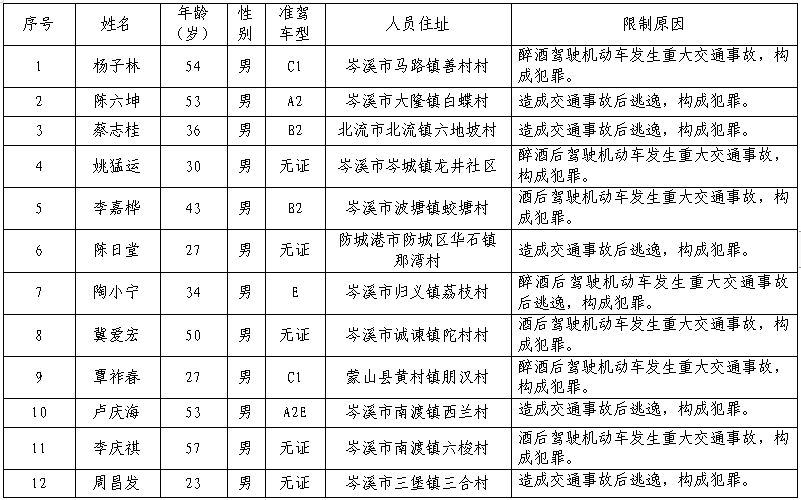 2019年至2022年4月期間,岑溪市公安機(jī)關(guān)偵辦的案件中共有27人因發(fā)生交通事故后逃逸或者飲酒醉酒駕駛機(jī)動(dòng)車發(fā)生重大交通事故構(gòu)成犯罪(經(jīng)人民法院判決),這些駕駛?cè)顺蛔肪肯嚓P(guān)刑事責(zé)任外,還被公安機(jī)關(guān)依法吊銷駕駛證并列入“終生禁駕”名單,現(xiàn)將“終生禁駕”人員予以曝光: