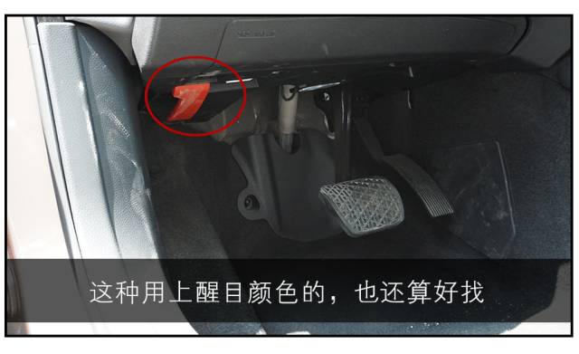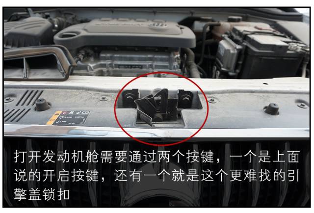 大多數(shù)車輛的引擎蓋鎖扣,都位于發(fā)動機艙正前方,所以有過一次經(jīng)驗之后就很容易找到了,但在發(fā)動機艙溫度較高時要小心被燙傷。