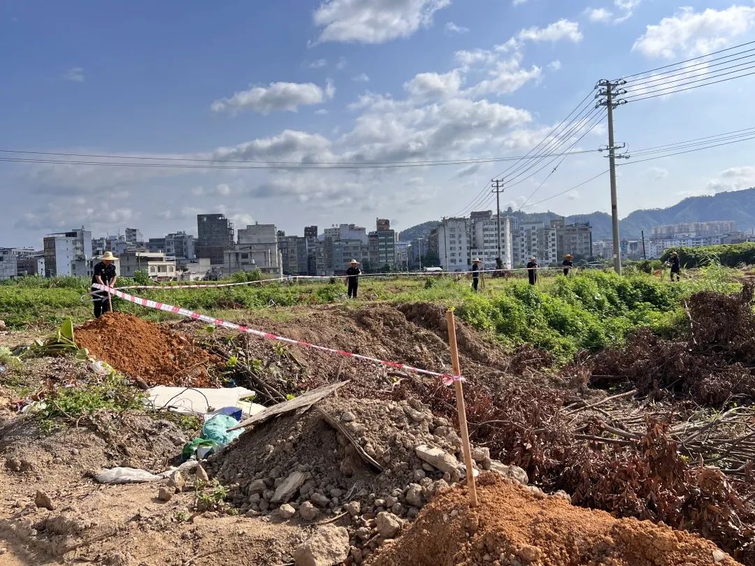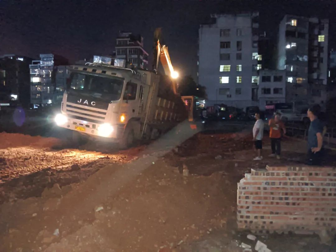 在現(xiàn)場,工作人員指揮著多臺挖掘機(jī)和推土機(jī)火力全開、默契配合,輪番對土表進(jìn)行泥土回填作業(yè)。