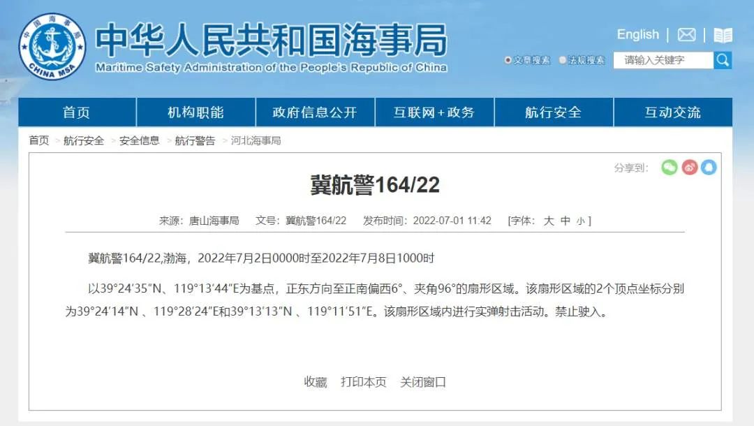 唐山海事局發(fā)布航行警告,2日0時至8日10時,渤海部分海域進(jìn)行實彈射擊活動,禁止駛?cè)搿?/span>