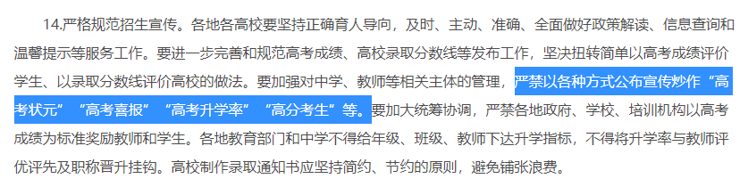 嚴(yán)禁通過任何形式公布、宣傳、炒作“高考狀元”“高考升學(xué)率”“高分屏蔽生”“高考喜報(bào)”等內(nèi)容,不得強(qiáng)制要求學(xué)生向班主任和學(xué)校報(bào)告高考成績,不得在錄取前統(tǒng)計(jì)發(fā)布高分考生分布統(tǒng)計(jì),嚴(yán)禁以高考成績?yōu)闃?biāo)準(zhǔn)獎(jiǎng)勵(lì)教師和學(xué)生