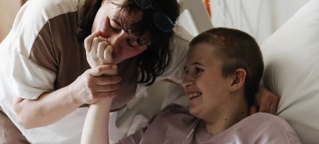 ?兒基會(huì)圖片/Tetiana Bundzilo|柳德米拉親吻她13歲女兒索菲亞的手,索菲亞在基輔奧克馬蒂特兒童醫(yī)院的一次炮彈襲擊中幸存下來(lái)