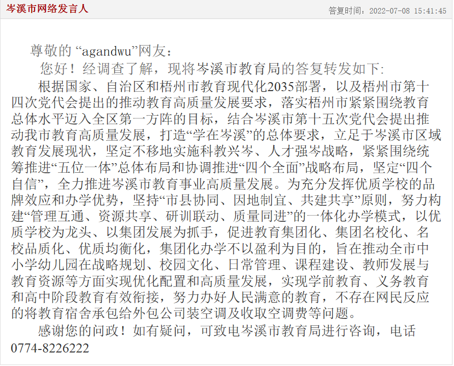 您好!經(jīng)調(diào)查了解,現(xiàn)將岑溪市教育局的答復(fù)轉(zhuǎn)發(fā)如下: