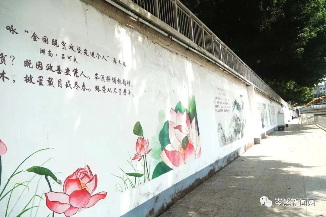 “客到花開春正好,當從畫里識岑溪”“盡道岑溪真福地,江山毓秀鐘靈”……詩詞部分的壁畫,一篇篇描繪岑溪風土人情的詩詞,搭配上中國傳統水墨畫,寥寥數筆將色彩交織在一起,讓人暢游在詩中意境的同時,也彷如進入了畫中的奇妙意境。