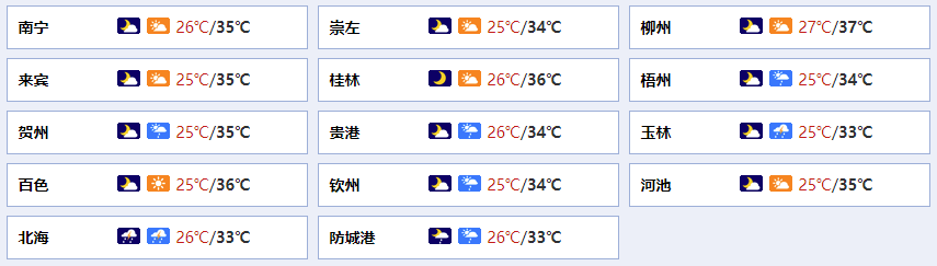 南寧市:多云,局地有陣雨或雷雨,東北風(fēng)1~2級(jí),最低氣溫26℃,最高氣溫35℃。