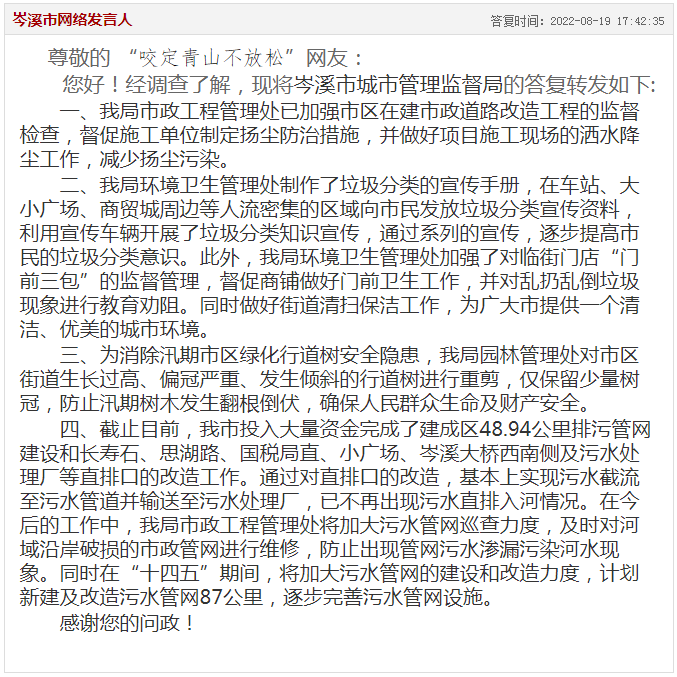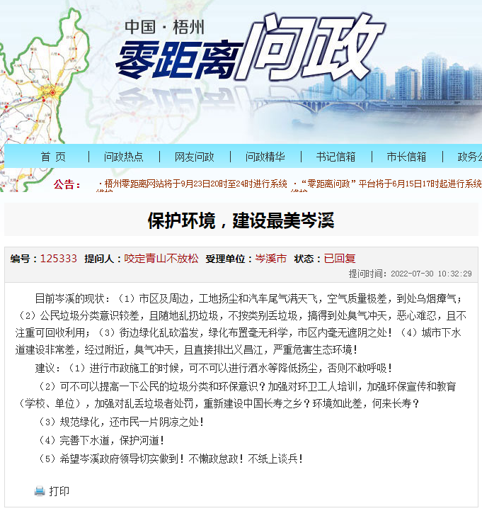 ▲官方答復(fù)截圖岑溪有多張國字號名片,包括中國綠色名市、全國生態(tài)文明先進(jìn)市、中國長壽之鄉(xiāng)等等,這令到每一位岑溪人倍感自豪。就怎樣保護(hù)環(huán)境、美化岑溪,還需要相關(guān)職能部門落實(shí)施行,同時廣大市民也應(yīng)該從自我做起,讓岑溪的天更藍(lán)、水更綠、空氣更有氧。