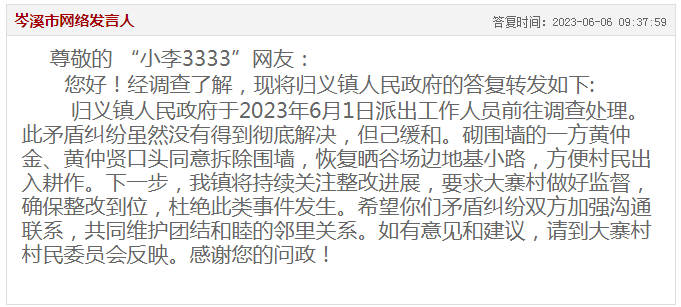 6月6日,官方回應來了!據(jù)歸義鎮(zhèn)人民政府答復表示,已調解處理,砌圍墻一方應承拆除圍墻。