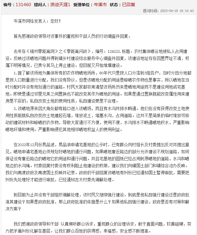 更早些時候,4月18日,零距離網(wǎng)友反映的問題,村里集體的曬谷地被個人占用建房,并且影響村民日常出行,這樣的行為是否合規(guī)合法?希望相關部門介入調查處理。原文篇幅較長,在此不逐一贅述,有興趣的讀者可以細看截圖。