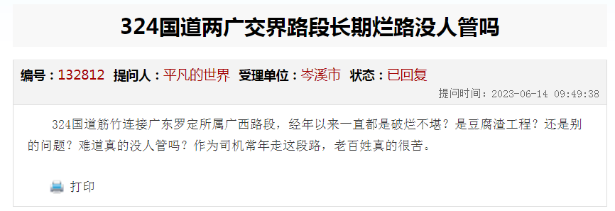 324國道筋竹連接廣東羅定所屬廣西路段,經(jīng)年以來一直都是破爛不堪?是豆腐渣工程?還是別的問題?難道真的沒人管嗎?作為司機常年走這段路,老百姓真的很苦。