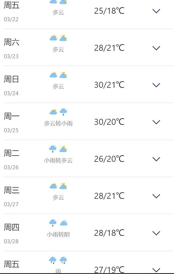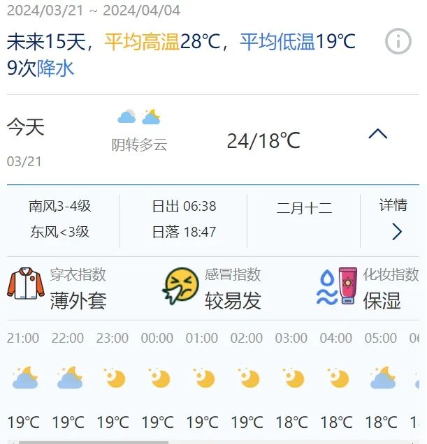 明晚到后天,全市多云間陰天,局部有小雨。偏東風1-2級。氣溫北部19-27℃,南部20-28℃。