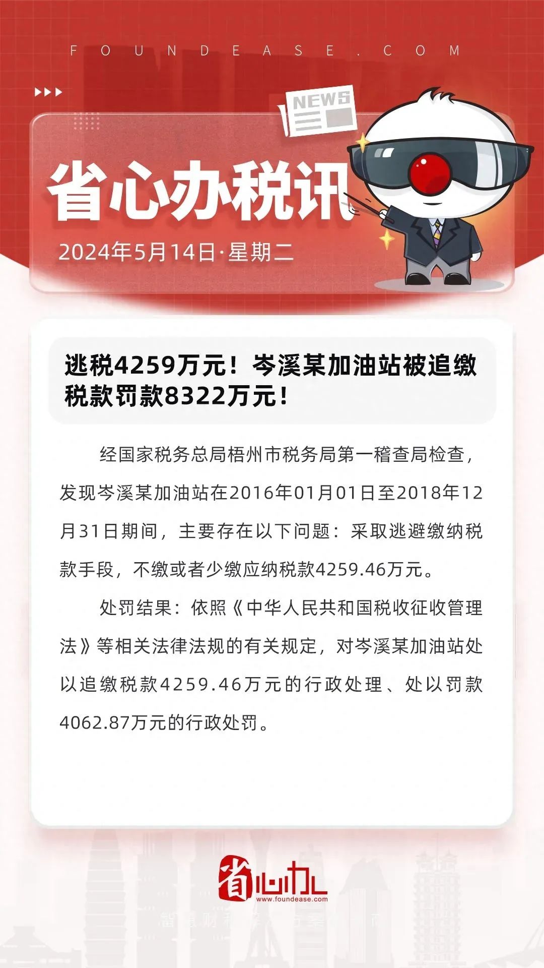據(jù)省心辦財稅2024年5月14日訊:經(jīng)國家稅務(wù)總局梧州市稅務(wù)局第一稽查局檢查,發(fā)現(xiàn)岑溪某加油站在2016年01月01日至2018年12月31日期間,主要存在以下問題:采取逃避繳納稅款手段,不繳或者少繳應(yīng)納稅款4259.46萬元。