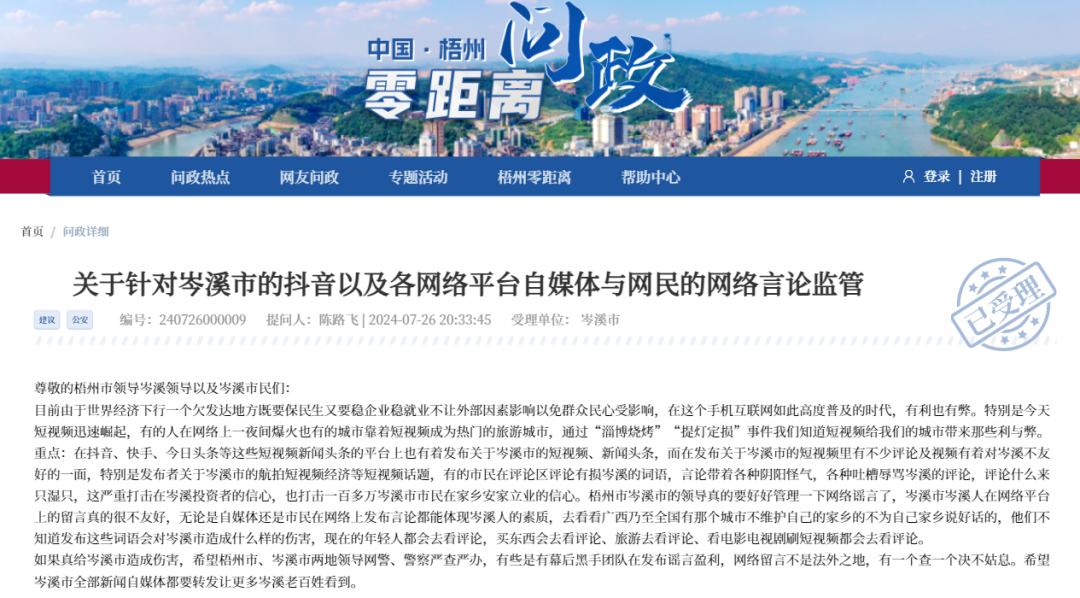 7月26日,有零距離網(wǎng)友就關(guān)于針對岑溪市的抖音以及各網(wǎng)絡(luò)平臺自媒體與網(wǎng)民的網(wǎng)絡(luò)言論監(jiān)管方面問題,問政反映如下,一起來關(guān)注。以下為網(wǎng)友原話: