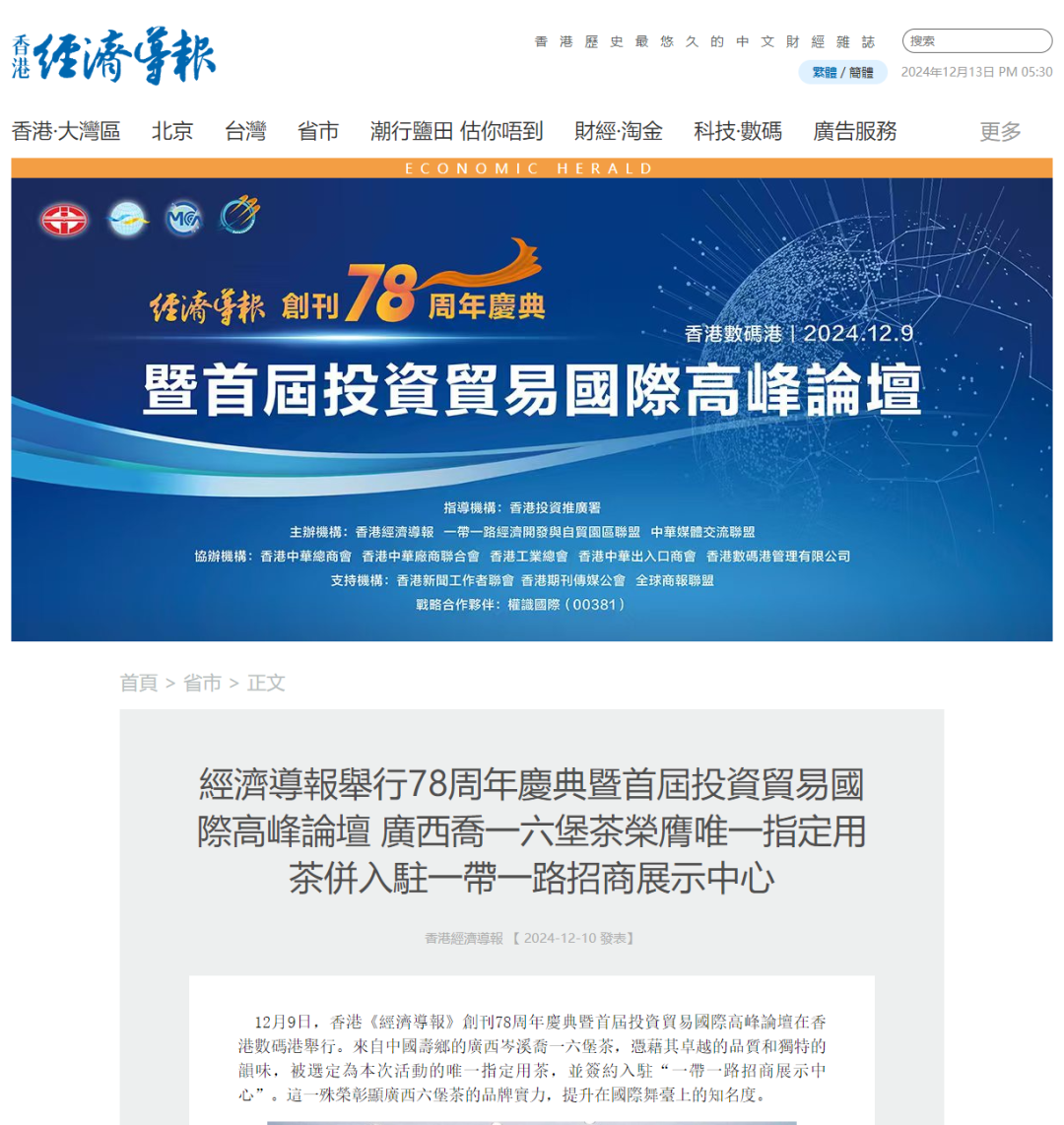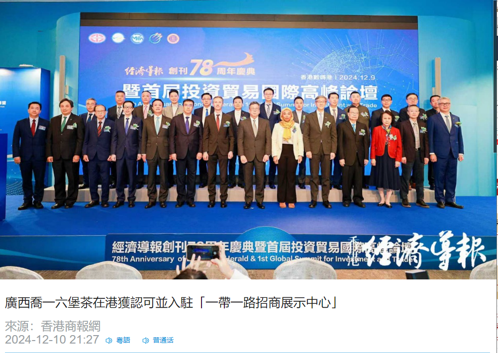 2024年12月9日,香港《經(jīng)濟(jì)導(dǎo)報(bào)》創(chuàng)刊78周年慶典暨首屆投資貿(mào)易國際高峰論壇在香港數(shù)碼港盛大舉行。據(jù)介紹,參加本次論壇的有海內(nèi)外知名的經(jīng)濟(jì)學(xué)家、“一帶一路”沿線國家的外交官、粵港澳大灣區(qū)的商會(huì)領(lǐng)袖、企業(yè)家、內(nèi)地有出海需求的政商代表和百行百業(yè)精英等300多人。