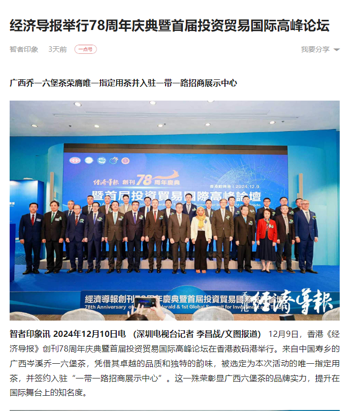 活動(dòng)中,來自中國長壽之鄉(xiāng)——廣西岑溪市通天頂?shù)膹V西岑溪喬一六堡茶,不僅榮膺本次活動(dòng)唯一指定用茶的,還成為首批入駐香港首個(gè)“三合一”出海服務(wù)平臺(tái)“一帶一路招商展示中心”。該公司在本次活動(dòng)中,派出茶藝師,在簽到區(qū)進(jìn)行茶藝表演,為嘉賓提供茶品鑒賞,贏得與會(huì)嘉賓的一致好評(píng)。這不僅讓與會(huì)嘉賓品嘗到了喬一六堡茶的醇厚茶香,更直觀地感受到了其獨(dú)特魅力。
