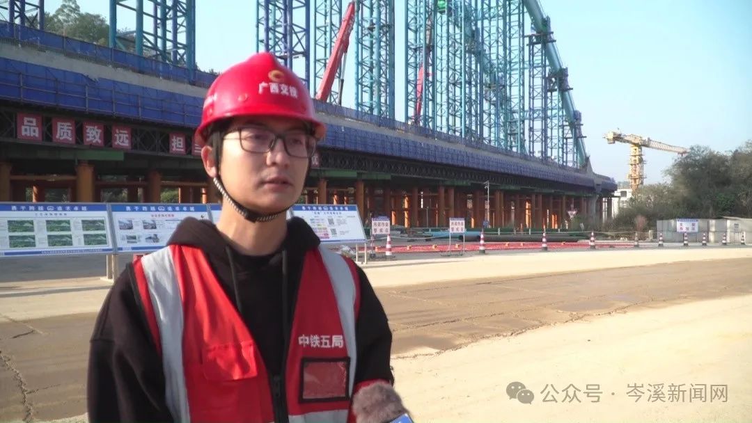 中鐵五局南珠高鐵玉岑段4標(biāo)三工區(qū)技術(shù)主管 毛文輝:“我們系桿拱最需要注意的就是它的拼裝精度,因為我們是有七節(jié)段,如果每一節(jié)段這個誤差往上面累積,可能就會在合龍的時候?qū)硬簧?,每一?jié)段我們都讓測量人員全程跟著測量,現(xiàn)場采用雙節(jié)段組拼、原位支架的安裝方法,這項工藝會降低我們現(xiàn)場的施工風(fēng)險,還有我們的施工成本,提升現(xiàn)場的安裝質(zhì)量。”