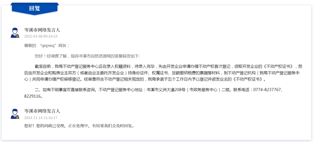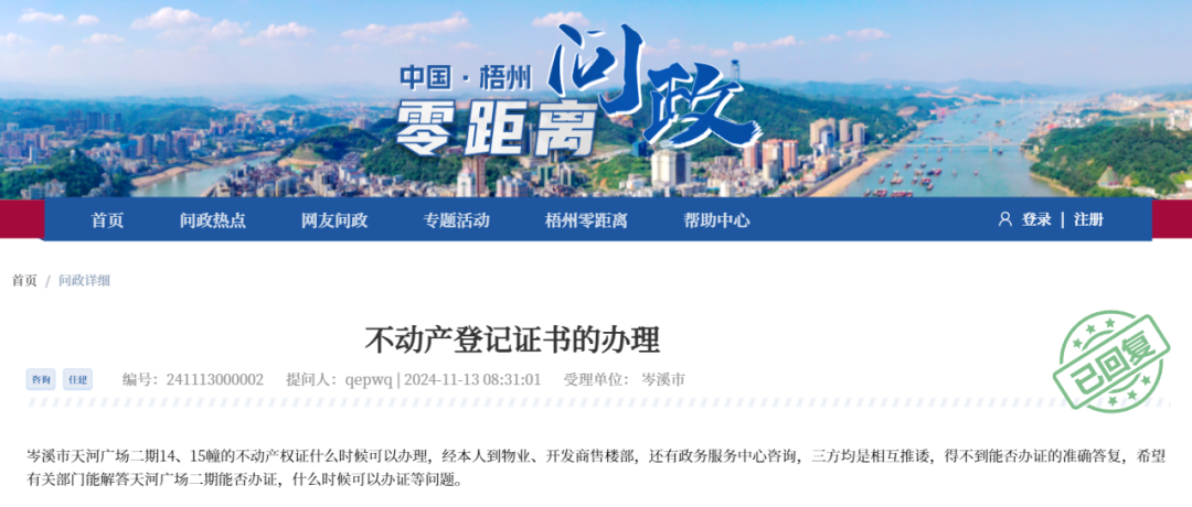 ▲梧州零距離網(wǎng)站截圖截至目前,我局不動產(chǎn)登記服務(wù)中心正在錄入權(quán)籍資料,待錄入完畢,先由開發(fā)企業(yè)申請辦理不動產(chǎn)權(quán)首次登記,領(lǐng)取開發(fā)企業(yè)的《不動產(chǎn)權(quán)證書》,然后由開發(fā)企業(yè)和購房業(yè)主雙方(或者由業(yè)主委托開發(fā)企業(yè))持身份證件、權(quán)屬證書、足額繳納稅費(fèi)的票據(jù)等材料,到不動產(chǎn)登記機(jī)構(gòu)(我局不動產(chǎn)登記服務(wù)中心)共同申請辦理產(chǎn)權(quán)轉(zhuǎn)移登記。經(jīng)審查符合不動產(chǎn)登記相關(guān)規(guī)定的,我局承諾于五個(gè)工作日內(nèi)予以登記并頒發(fā)業(yè)主的《不動產(chǎn)權(quán)證書》。