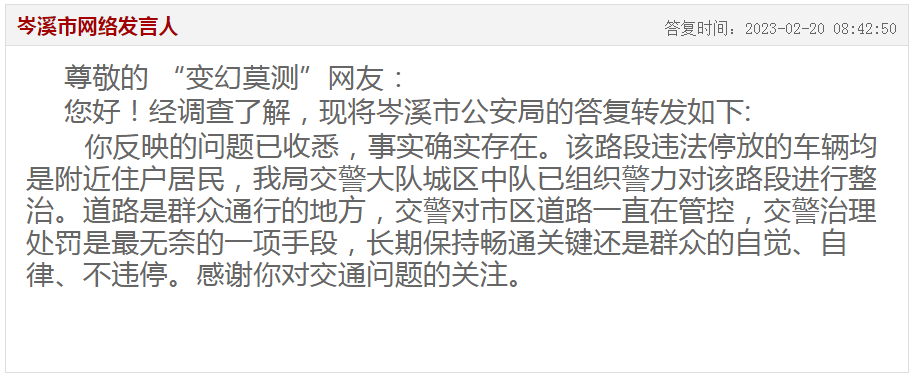 你反映的問題已收悉,事實確實存在。該路段違法停放的車輛均是附近住戶居民,我局交警大隊城區(qū)中隊已組織警力對該路段進行整治。道路是群眾通行的地方,交警對市區(qū)道路一直在管控,交警治理處罰是最無奈的一項手段,長期保持暢通關(guān)鍵還是群眾的自覺、自律、不違停。感謝你對交通問題的關(guān)注。