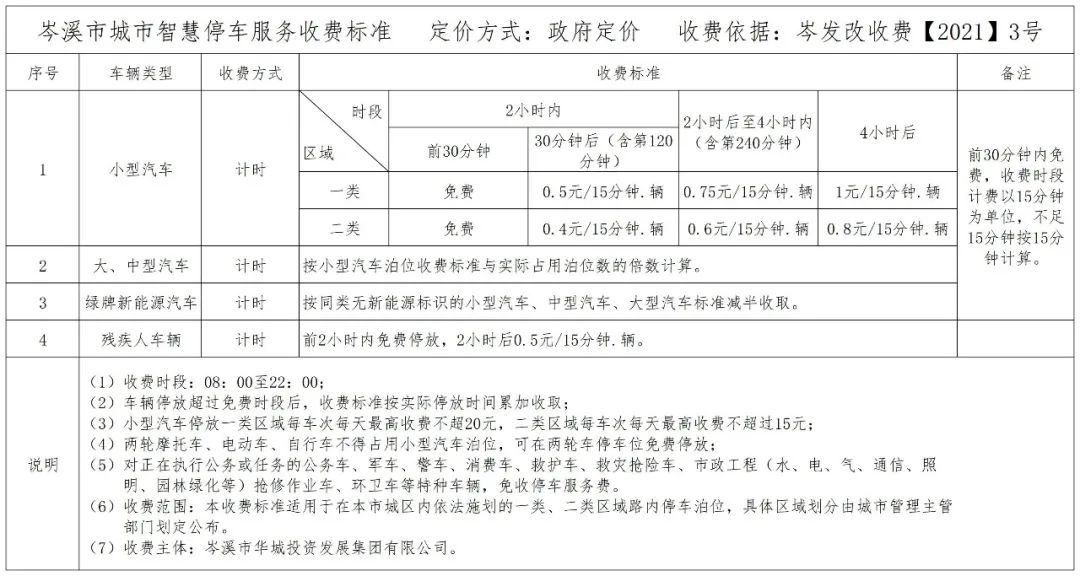 根據(jù)《岑發(fā)改收費(fèi)【2021】3號(hào)》,本市對(duì)于占用臨時(shí)停車位按小時(shí)收費(fèi)實(shí)行政府定價(jià)管理,具體收費(fèi)標(biāo)準(zhǔn)如下: