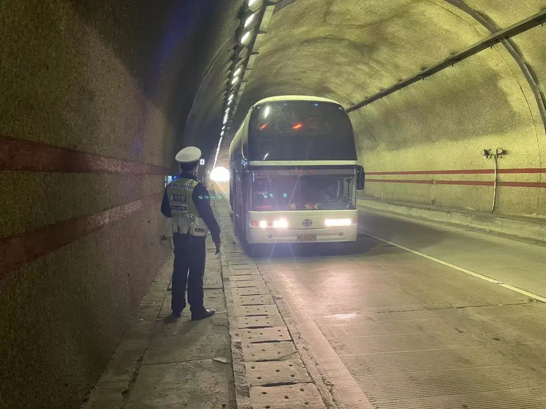 2月28日下午,梧州市公安局交警支隊民警、輔警在包茂高速梧州段開展巡邏管控工作。14:40分左右,民警、輔警巡邏至倒水鎮(zhèn)包茂高速公路隧道時,發(fā)現(xiàn)一輛旅游客車停在隧道里面無法移動。
