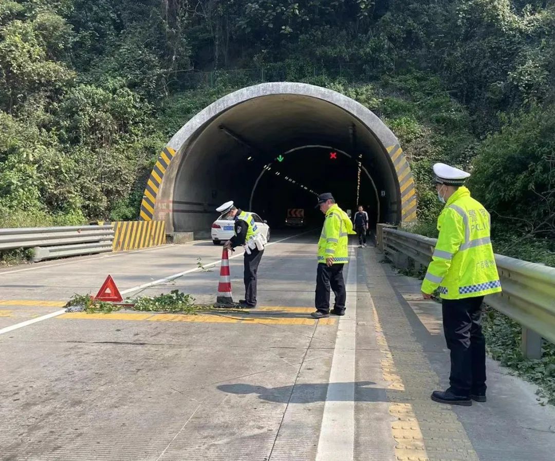 面對如此緊急情況,為避免事故發(fā)生,民警立即啟動隧道故障車輛應(yīng)急處置預(yù)案,將警車停在客車后邊,下車擺放安全反光錐桶做好安全防護民警及時拉響警笛,提醒后方司乘注意前方路況,減速慢行。