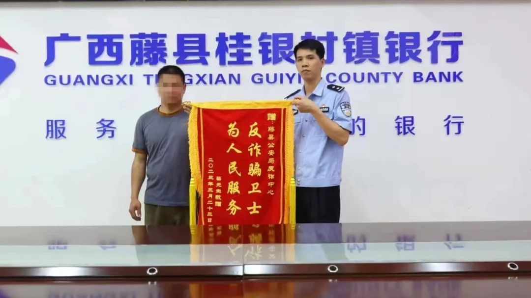 “真的太感謝你們了!”3月23日下午,梧州藤縣的梁先生給藤縣公安局反詐中心民警送來印有“反詐騙衛(wèi)士 為人民服務(wù)”的錦旗,對(duì)民警及時(shí)勸阻,為其挽回了12萬余元的財(cái)產(chǎn)損失表示感謝。