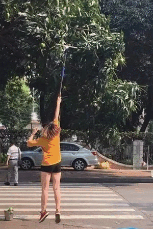 在車(chē)來(lái)車(chē)往的馬路邊上樹(shù)摘芒果,