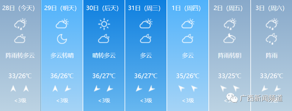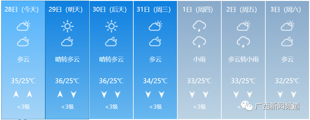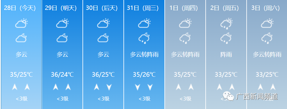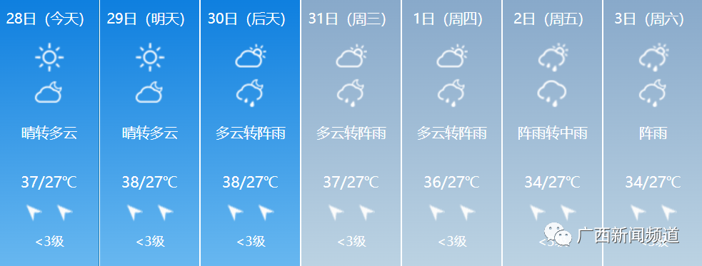 廣西氣象臺首席預報員 董良淼:特別是桂東北這一帶,最高氣溫將會下降到30℃到34℃。其他地區(qū)就是主要是南部和西部,最高氣溫是略有下降,仍然會有34℃到36℃,局地37℃。