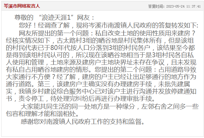 處理結(jié)果來了,一起來看看職能部門的回應(yīng)!對(duì)于網(wǎng)友所反映的問題,近日,岑溪市南渡鎮(zhèn)人民政府答復(fù)表示: