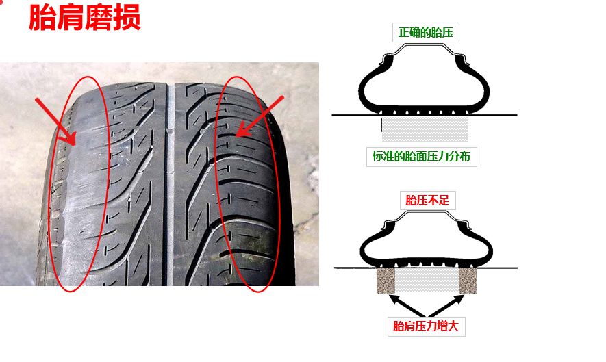 低胎壓:與高胎壓磨損中心相反,胎壓過低,則胎冠內(nèi)縮,會(huì)導(dǎo)致輪胎兩側(cè)的磨損。而且,胎壓低與扁平比小有類似情況,胎側(cè)受擠壓時(shí),輪轂與地面直接撞擊,也很容易造成簾布層線的斷裂,要么爆胎,要么鼓包。