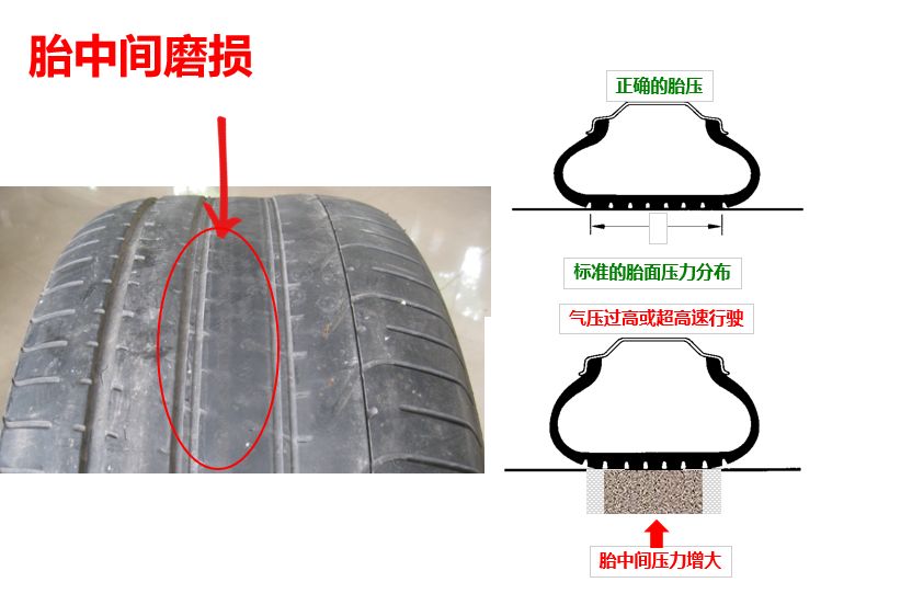 高胎壓:如果輪胎氣壓過高,輪胎的剛性增大,變形和接地面積減小,首先會(huì)導(dǎo)致使胎面中部的單位壓力增大,磨損加劇,產(chǎn)生胎冠中央磨損現(xiàn)象,影響到舒適性并將降低輪胎壽;同時(shí),還會(huì)使輪胎抓地力減少(尤其在濕滑路面,會(huì)影響制動(dòng)距離),也會(huì)造成輪胎的磨損速加快,導(dǎo)致輪胎磨損不均勻。