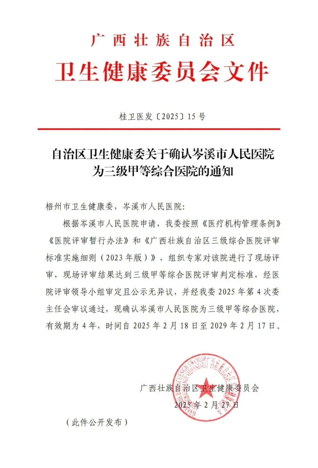 2025年2月27日,廣西壯族自治區(qū)衛(wèi)生健康委員會正式發(fā)文,經(jīng)資格審查、現(xiàn)場評審、綜合評分、結(jié)果公示,確認(rèn)岑溪市人民醫(yī)院為三級甲等綜合醫(yī)院。